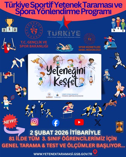 2025-2026 eğitim-öğretim yılında öğrenim gören yaklaşık 1 milyon 356 Bin 3. sınıf öğrencimizin Türkiye Sportif Yetenek Taraması ve Spora Yönlendirme Programının ilk adımı olan “Genel Tarama-Test ve Ölçümler” aşaması 2 Şubat 2026 tarihi itibarıyla başlayacak olup 28 Haziran 2026 tarihine kadar devam etmesi planlanmaktadır.